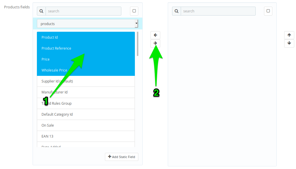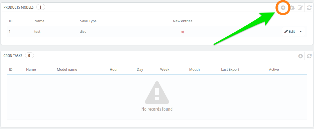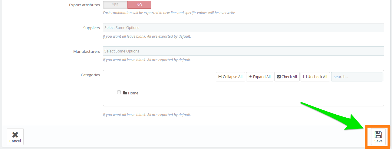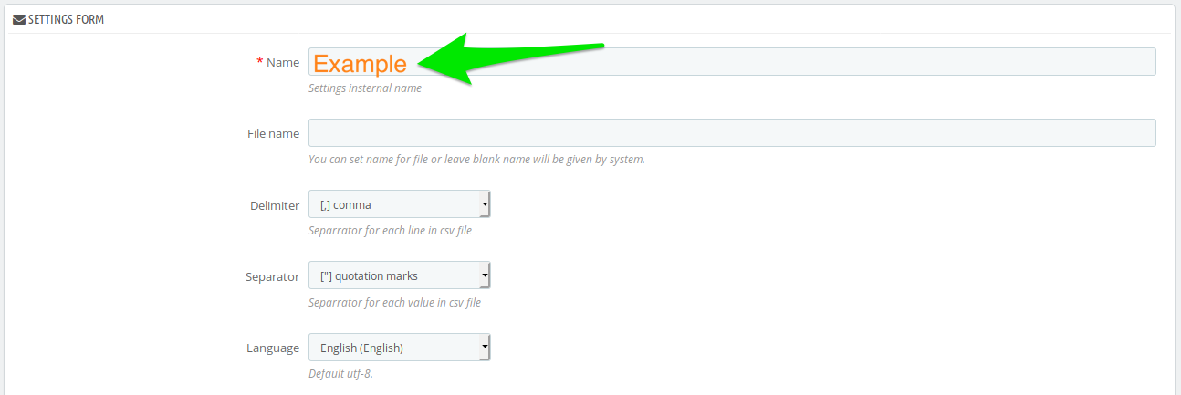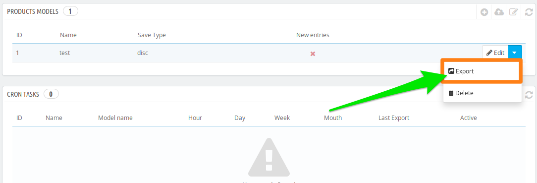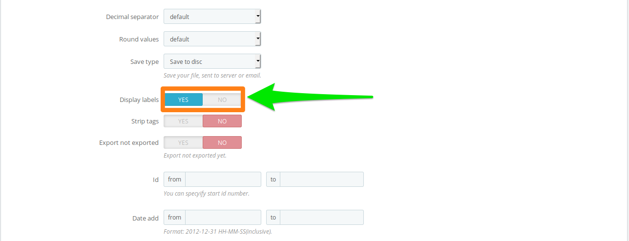 1. Click add export model. 2. Fill name field. 3. Select show labels. 4. Select database fields to export. 5. Save settings. 6. Export 7. Download file