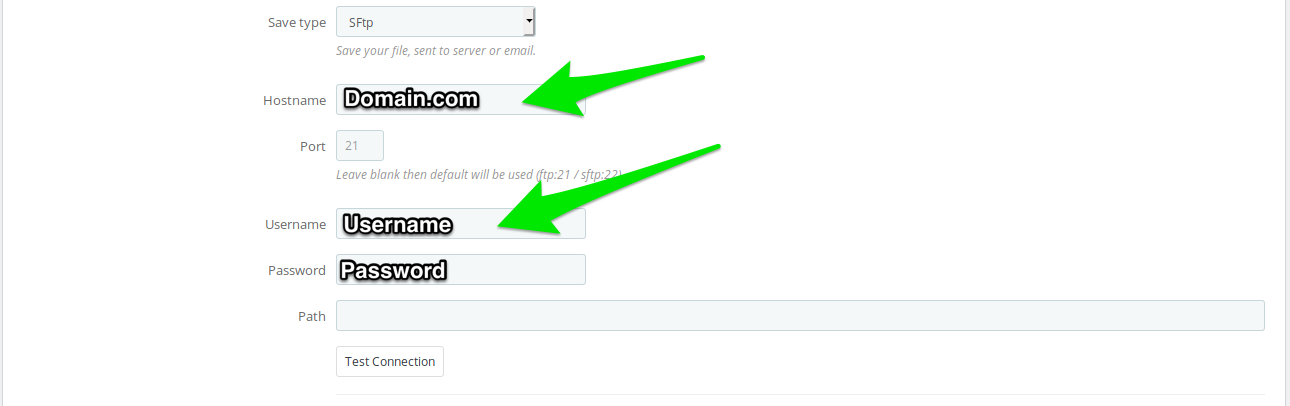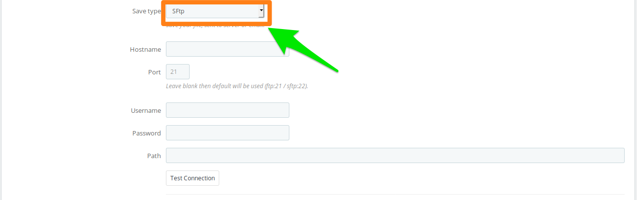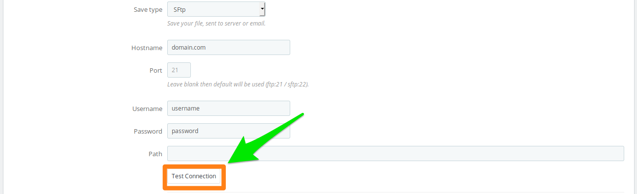 1. Select save type FTP / SFTP 2. Fill connection form. Path on the server is optional. 3. Test connection.